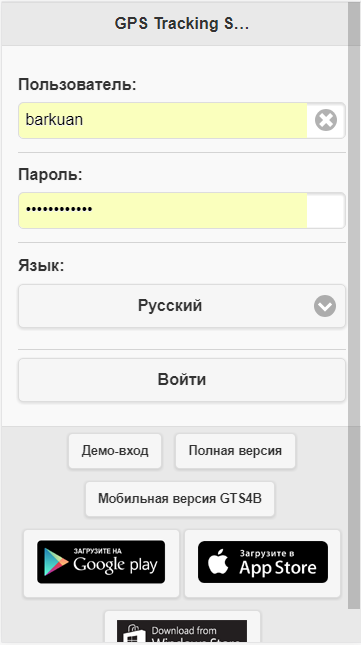 При нажатии на кнопку "Мобильная версия GTS4B" вы зайдете в мобильную версию системы GTS4B для мобильных устройств.