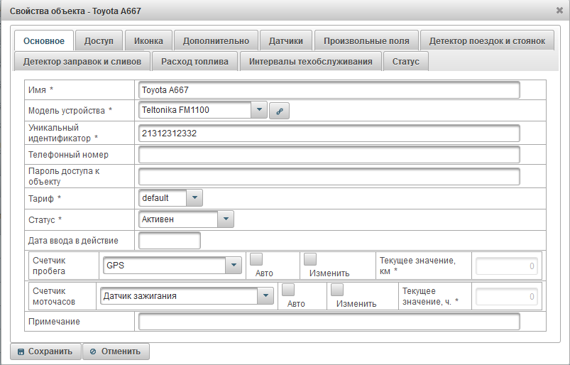 Если устройство настроен корректно и присылает данные в Систему, то чтобы увидеть его на карте, в системе необходимо создать для него объект. При создании объекта нужно заполнить следующие поля: