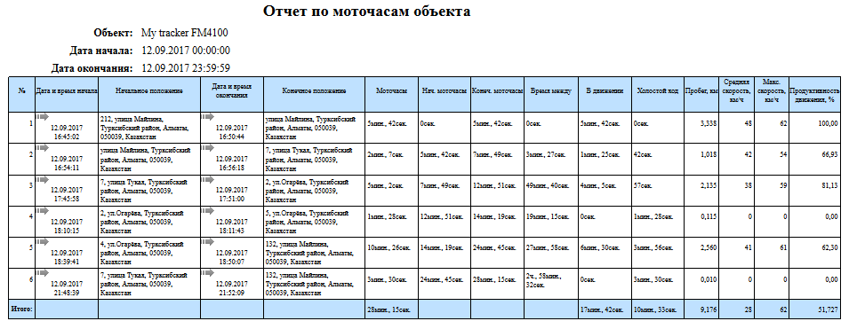 {"count":2,"motohours":[{"finish_motohours_in_sec":590,"message_id_list":[697737,697738,697739,697740,697741,697742,697743,697744,697745,697746,697747,697748,697749,697750,697751,697752,697753,697754,697755],"message_cnt":19,"time_from_prev_end_to_cur_beg":0,"duration_in_sec":590,"start_message_id":697737,"finish_message_lon":76.8967104,"motohours_in_sec_str":"9min., 50s.","start_message_location":"289/1, улица Розыбакиева, Баганашыл, Almaty, Бостандыкский район, Almaty, 050023, Kazakhstan","start_message_coordinates_str":"43.194832, 76.893901 (5)","start_message_lon":76.8939008,"start_message_lat":43.194832,"time_from_prev_end_to_cur_beg_str":"","finish_motohours_in_sec_str":"9min., 50s.","finish_message_dt":"01.06.2016T10:44:56","movement_productivity":89.83,"mileage":3397,"start_motohours_in_sec":0,"start_motohours_in_sec_str":"","duration_short_str":"9min., 50s.","motohours_in_sec":590,"avg_speed_in_kph":34,"finish_message_coordinates_str":"43.214048, 76.89671 (8)","finish_message_location":"31, Baikadamov St, Баганашыл, Almaty, Бостандыкский район, Almaty, 050060, Kazakhstan","obj_id":10524,"finish_message_lat":43.214048,"movement_time_in_sec":530,"finish_message_id":697755,"movement_time_in_sec_str":"8min., 50s.","max_speed_in_kph":50,"idling_time_in_sec":60,"start_message_dt":"01.06.2016T10:35:06","idling_time_in_sec_str":"1min."},{"finish_motohours_in_sec":820,"message_id_list":[697929,697930,697931,697932,697933,697934,697935,697936,697937,697938],"message_cnt":10,"time_from_prev_end_to_cur_beg":1272,"duration_in_sec":230,"start_message_id":697929,"finish_message_lon":76.894336,"motohours_in_sec_str":"3min., 50s.","start_message_location":"217, Gagarin Ave, Баганашыл, Almaty, Бостандыкский район, Almaty, 050060, Kazakhstan","start_message_coordinates_str":"43.213459, 76.897894 (8)","start_message_lon":76.8978944,"start_message_lat":43.2134592,"time_from_prev_end_to_cur_beg_str":"21min., 12s.","finish_motohours_in_sec_str":"13min., 40s.","finish_message_dt":"01.06.2016T11:09:58","movement_productivity":100,"mileage":1834,"start_motohours_in_sec":590,"start_motohours_in_sec_str":"9min., 50s.","duration_short_str":"3min., 50s.","motohours_in_sec":230,"avg_speed_in_kph":36,"finish_message_coordinates_str":"43.200099, 76.894336 (8)","finish_message_location":"Кожабекова, Kozhabekov St, Баганашыл, Almaty, Бостандыкский район, Almaty, 050023, Kazakhstan","obj_id":10524,"finish_message_lat":43.2000992,"movement_time_in_sec":230,"finish_message_id":697938,"movement_time_in_sec_str":"3min., 50s.","max_speed_in_kph":43,"idling_time_in_sec":0,"start_message_dt":"01.06.2016T11:06:08","idling_time_in_sec_str":""}]}