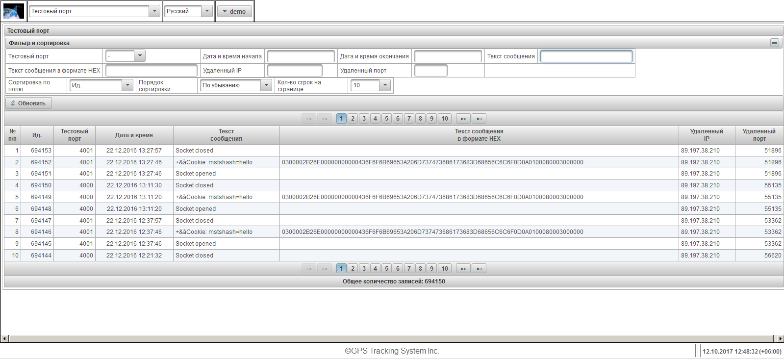 В случае корректной настройки объекта, данные начнут поступать в систему. При поступлении нового сообщения от объекта, будет появлятся новая запись в журнале. Чтобы просмотреть журнал, в нижней панели справа нажмите на кнопку отображения журнала