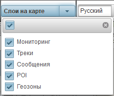 Многие панели могут иметь свои слои на карте: «Мониторинг», «Треки», «Сообщения», «Точки интереса», «Геозоны». Графические элементы, нанесенные на карту в той или иной панели, могут легко отключаться и включаться. Отображение или скрытие тех или иных слоев настраивается в верхней панели.