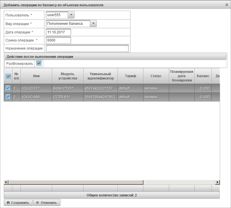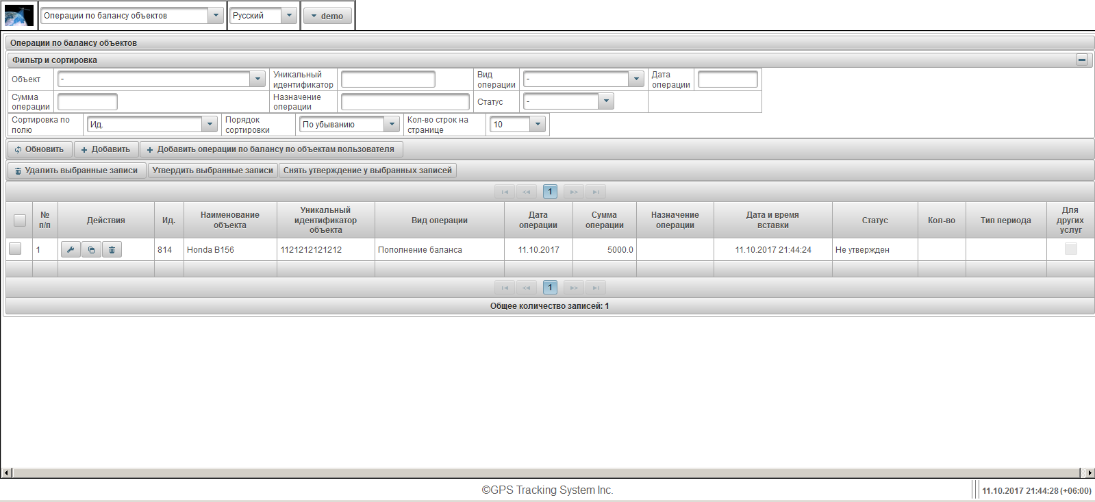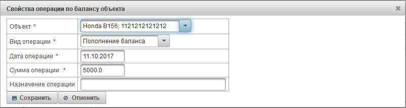 Панель "Операции по балансу объектов" доступна только для дилеров и позволяет добавлять операции по балансу объектов, например когда пользователь оплачивает абонентскую плату за объект или когда вы хотите вручную снять баланс у объекта за предоставленные услуги.